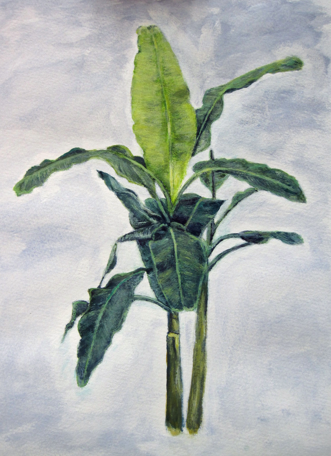 Am Sonntag trafen wir uns im Palmengarten Frankfurt, da schlechtes Wetter vorhergesagt war, was sich auch prompt einstellte. Es regnete seit dem frühen Morgen. Nachdem wir sämtliche Glashäuser durchstreift hatten, entschied ich mich für das Palmenhaus, in dem auch Skulpturen ausgestellt waren. Hier war die Luft sehr angenehm und die Besucherfrequenz etwas geringer. Schnell war eine Bank und ein passendes Motiv gefunden. Eine Bananenpflanze hatte es mir angetan. Die Aufgabe war, eine Grisaille anzufertigen, um dann mit Lasuren zu arbeiten. Dabei wurde das Grau nicht aus schwarz und weiß gemischt, sondern z.B. aus Ghromoxidgrün und Magenta. Besonders schwierig war die Mischung verschiedener Grüntöne, wobei mir Fides Becker sehr zur Seite stand. Nach ca. fünf Stunden reiner Malzeit waren wir mit dem Ergebnis sehr zufrieden.